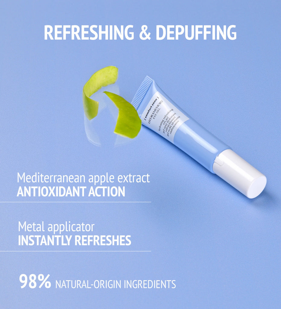 Fresh, hydrating gel rich in Polyphenols. It provides relief to tired eyes with puffiness and dark circles. Metal applicator for pleasant, functional and refreshing application.